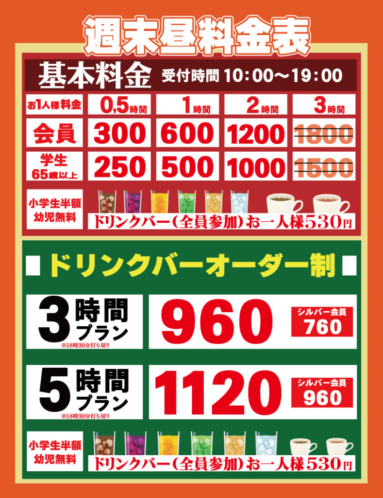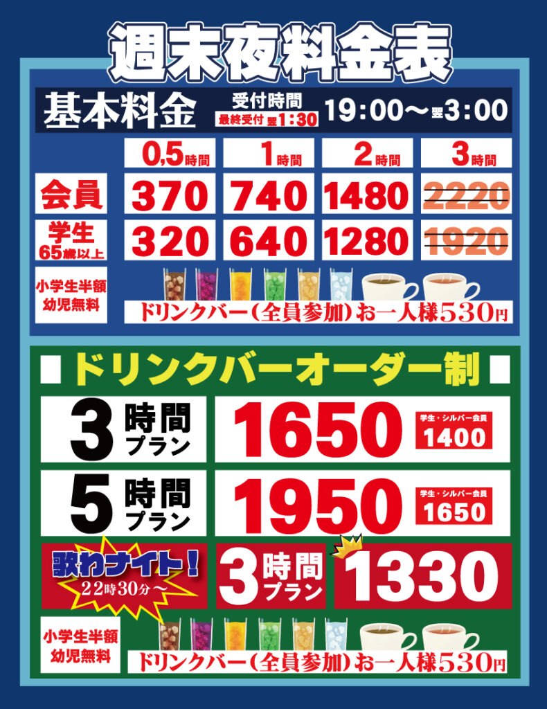 | 営業時間 | 平日・日・祝日AM10:00~翌AM1:30 ※最終受付 AM0:30まで 金・土・祝前AM11:00~翌AM3:00 ※最終受付 AM1:30まで |