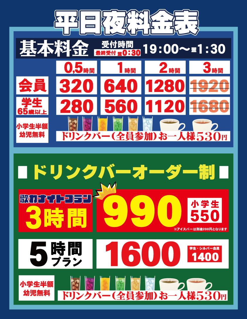 | 営業時間 | 平日・日・祝日AM10:00~翌AM1:30 ※最終受付 AM0:30まで 金・土・祝前AM11:00~翌AM3:00 ※最終受付 AM1:30まで |