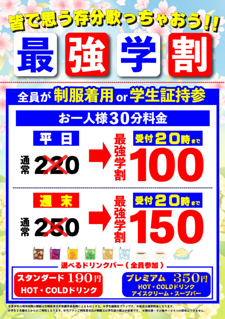 ※学生料金ご利用は学校指定制服もしくは学生証明書のご提示をお願い致します。(ご提示頂けない場合、学生プランのご利用はできません)